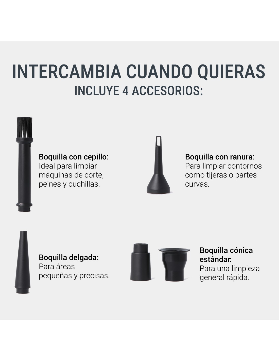 Soplador Turbo Wind Ragnar. El TURBO WIND ofrece un flujo de aire potente y eficiente, ideal para la limpieza meticulosa de máquinas de corte, tijeras y superficies en barberías. También se revela como una herramienta invaluable para eliminar los residuos capilares del cuello y rostro tras el corte. Este dispositivo cuenta con una versátil función 2 en 1, que permite tanto el soplado de aire como la aspiración, adaptándose a diversas exigencias de limpieza. Su diseño inalámbrico y portátil lo hace sumamente práctico. Incluye cuatro accesorios que facilitan su uso en distintas superficies.